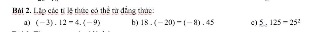 Có 4 tỉ lệ thức có thể lập từ đẳng thức `18 × (-20) = -8 × 45`, là