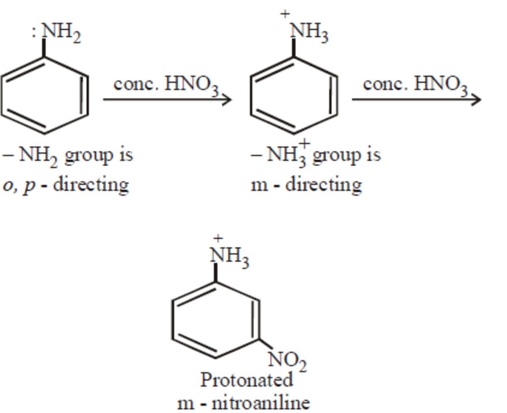 Do đó để tiến hành nitro hoá aniline, phải tiến hành bảo vệ nhóm amine bằng cách biết nhóm amine thànn nhóm amide (ví dụ: sử dụng $AcCl$)