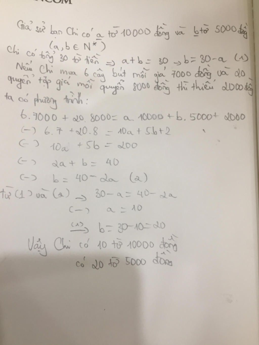 Gọi số tờ tiền loaị $10.000$ đồng là: $a$