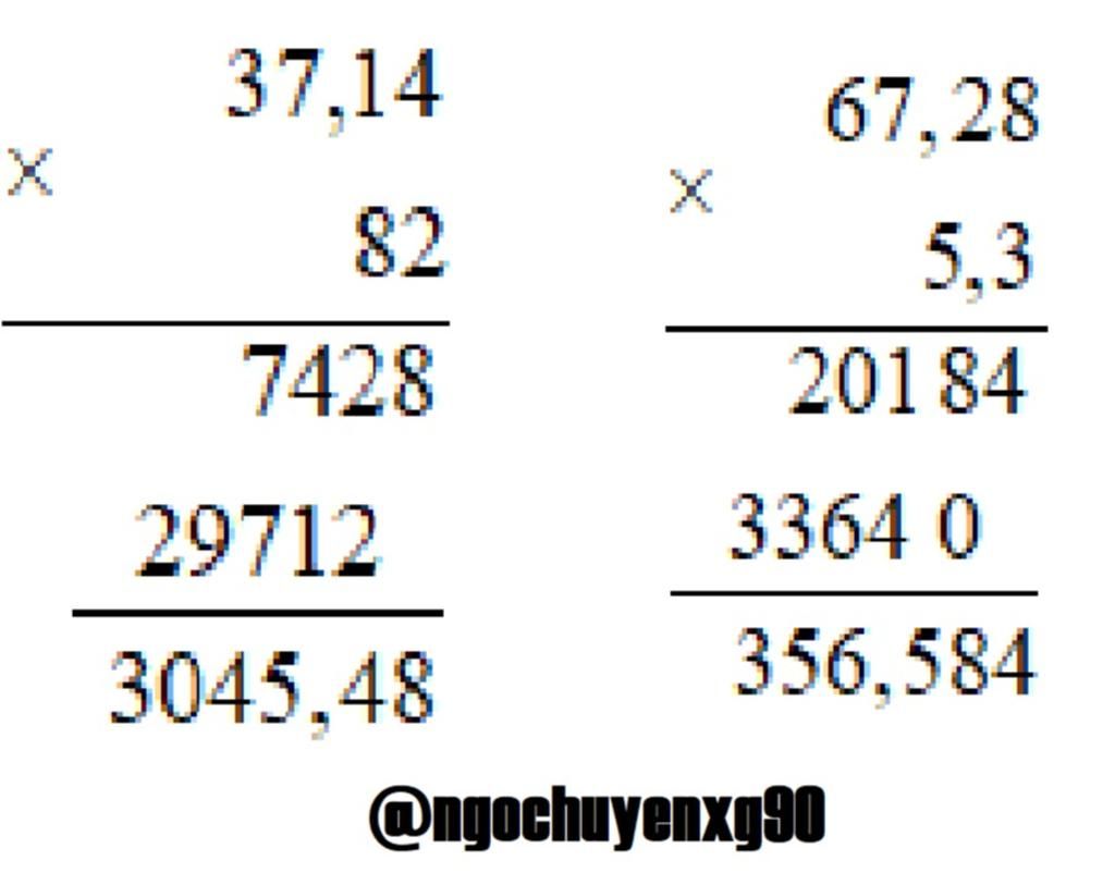a) 37,14 × 82 = 3045,48 b) 67,28 × 5,3 = 356,584