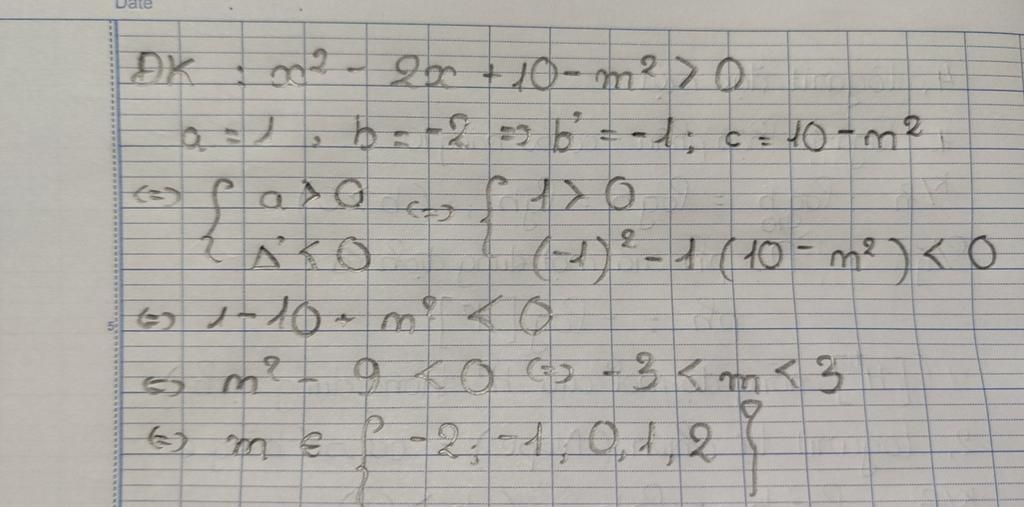 Có tất cả bao nhiêu giá trị nguyên của tham số m để hàm số y= ln(x²-2x+10-m²) xác định với mọi x ∈ R