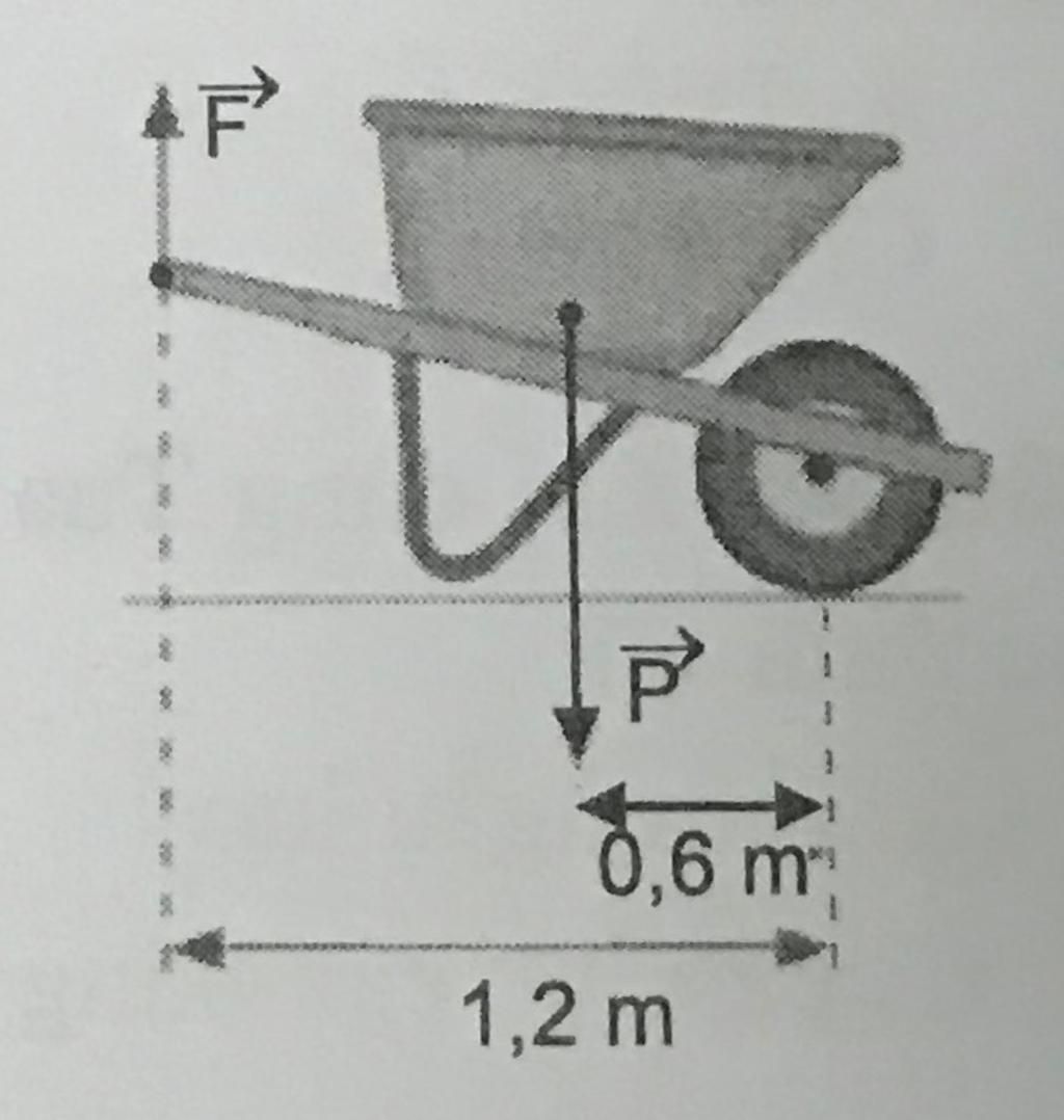 Một chiếc xe đẩy chuyển vật liệu có cấu tạo như hình vẽ. Tổng khối lượng vật liệu và xe là 100 kg. Áp dụng quy tắc moment, tính lực nâng đặt vào tay cầm để giữ xe thăng bằng. Lấy g = 10 m/s2.