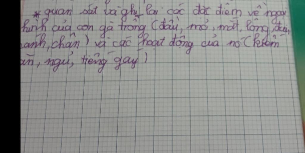 quan sát và ghi lại các dặc điểm về ngoại hình của con gà trống(đầu,mỏ,mắt,lông,đui,cánh,chân)và các hoạt đọng của nó(kiếm ăn,ngủ,tiếng gáy)