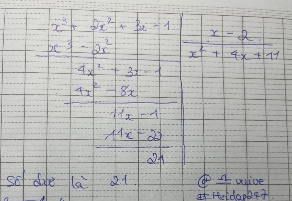Vậy khi chia f(x) cho g(x) thì được số dư là 21.