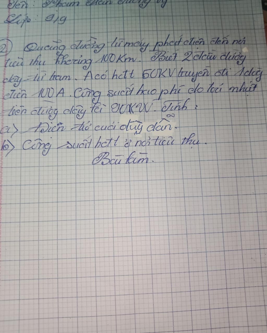 b) Công suất tại trạm: `\ccP = U*I = 50 * 10^3 * 100 = 5 *10^6 (W)`