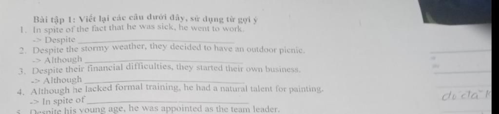 `=` Despite `+` N/cụm N/V-ing, S `+` V `+` O..