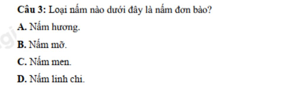 Câu 3: Loại nấm nào dưới đây là nấm đơn bảo?