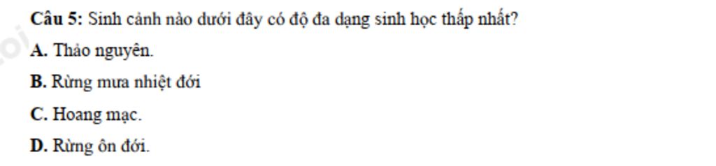 `-` Hoang mạc là nơi có khí hậu khắc nghiệt, chênh lệch nhiệt độ ngày và đêm cao, lượng mưa ít nên dẫn đến độ đa dạng sinh học thấp.