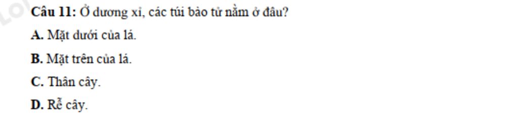 Dương xỉ có các túi bào tử nằm ở mặt dưới của lá già `=>` Chọn A
