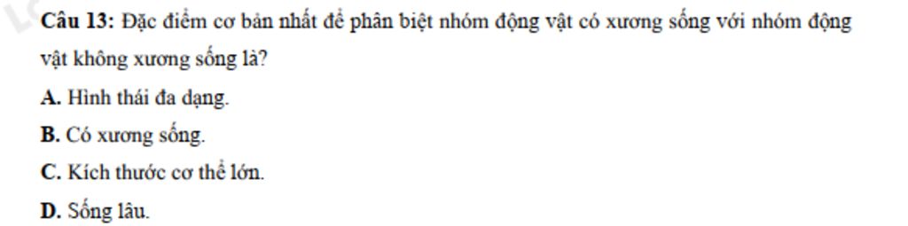 Để phân biệt động vật có xương sống và động vật không có xương sống thì đặc điểm dễ phân biệt nhất là động vật ấy có xương sống hay không, có thì là động vật có xương sống, không là động vật không có xương sống `=>` Chọn B