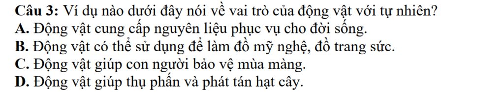 Câu 3: Ví dụ nào dưới đây nói về vai trò của động vật với tự nhiên?
