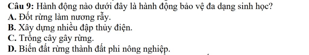 Câu 9: Hành động nào dưới đây là hành động bảo vệ đa dạng sinh học?