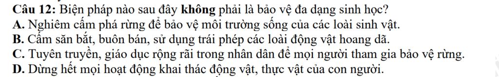 Câu 12: Biện pháp nào sau đây không phải là bảo vệ đa dạng sinh học?
