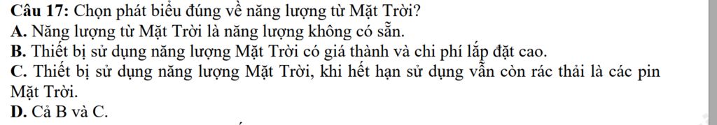 Câu 17: Chọn phát biểu đúng về năng lượng từ Mặt Trời?