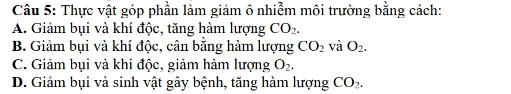 Giải thích: Thông qua quá trình trao đổi khí ở thực vật giúp lượng bụi và khí độc giảm đi, cân bằng lượng khí CO2 và O2 trong môi trường