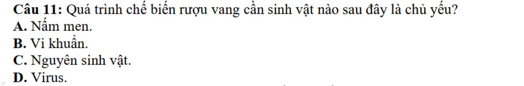 `-`Quá trình chế biến rượu vang cần nấm men là chủ yếu để lên men rượu.