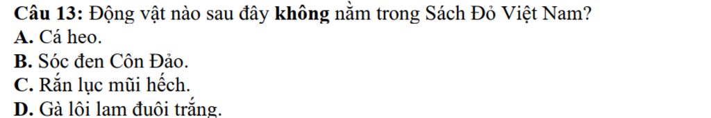 Câu `13:` Động vật nào sau đây không nằm trong Sách Đỏ Việt Nam?