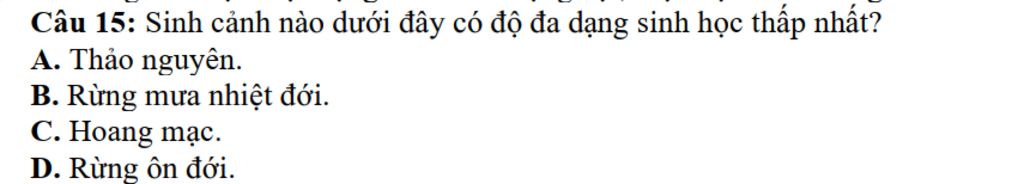 `-.``bbC`$\\$Hoang mạc là nơi có khí hậu khắc nghiệt, lượng mưa rất ít khiến cho các loài sinh vật không thể thích nghi$\\$`=>`Độ đa dạng sinh học thấp nhất