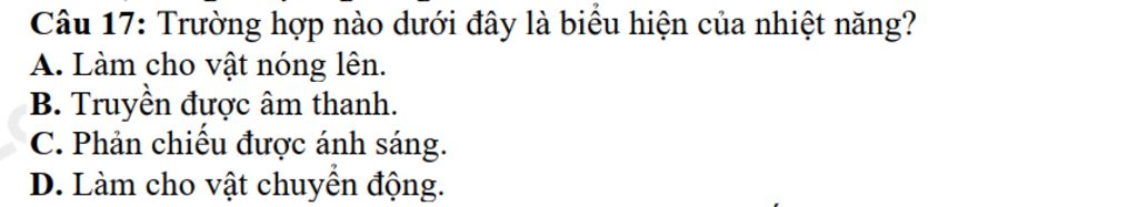 Câu 17: Trường hợp nào dưới đây là biểu hiện của nhiệt năng?