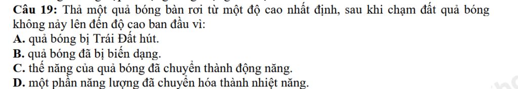 `@` Do chịu lực cản của không khí nên cơ năng của quả bóng bàn bị chuyển hóa 1 phần thành nhiệt năng làm thay đổi nên không bật lên được như ban đầu.
