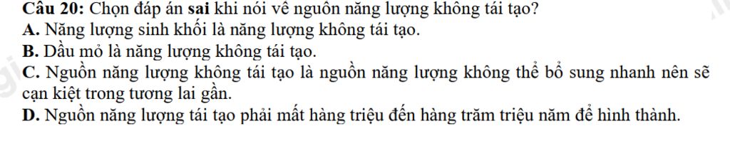 Câu 20: Chọn đáp án sai khi nói về nguồn năng lượng không tái tạo?