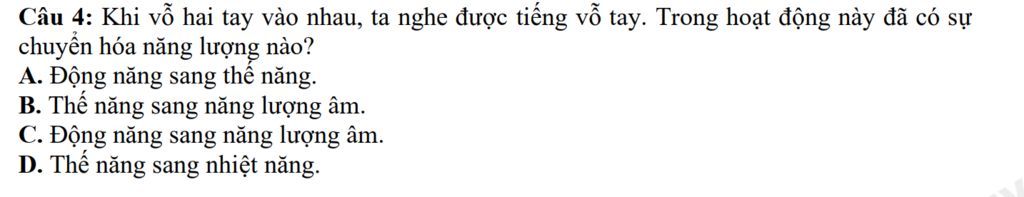 `->``bbC`$\\$Khi vỗ hai tay vào nhau, ta nghe được tiếng vỗ tay. Trong hoạt động này đã có sự chuyển hóa năng lượng động năng sang năng lượng âm