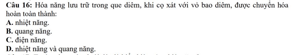 `=>` Hóa năng lưu trữ trong que diêm, khi cọ xát với vỏ bao diêm, được chuyển hóa hoàn toàn thành: Quang năng (ánh sáng của ngọn lửa) và Nhiệt năng (hơi nóng của ngọn lửa)