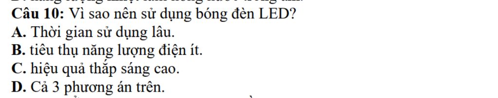 Câu `10:` Vì sao nên sử dụng bóng đèn $LED$?