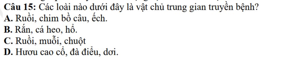 Câu 15: Các loài nào dưới đây là vật chủ trung gian truyền bệnh?