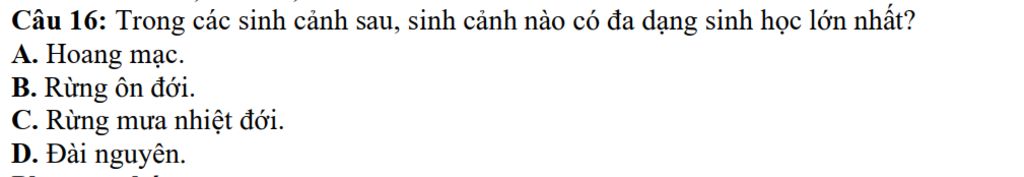 `->``bbC`$\\$Rừng mưa nhiệt đới có điều kiện khí hậu và môi trường thuận làm cho các loài sinh vật phát triển nên là nơi đa dạng sinh học lớn nhất