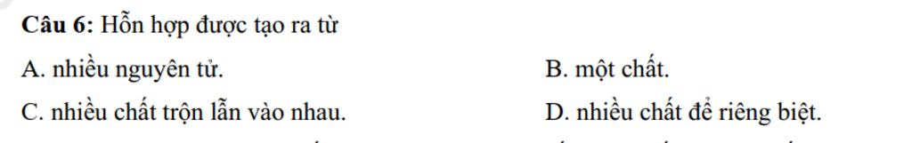 ⇒ Hỗn hợp được tạo ra từ nhiều chất trộn lẫn vào nhau.