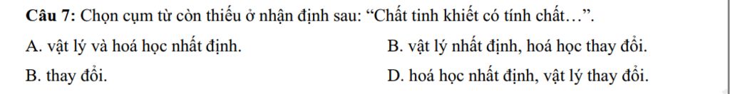 ⇒ Chất tinh khiết có tính chất vật lý và hoá học nhất định, không thay đổi.