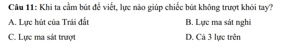 Câu 11: Khi ta cầm bút để viết, lực nào giúp chiếc bút không trượt khỏi tay?