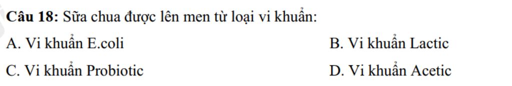 Câu `18:` Sữa chua được lên men từ loại vi khuẩn `:`