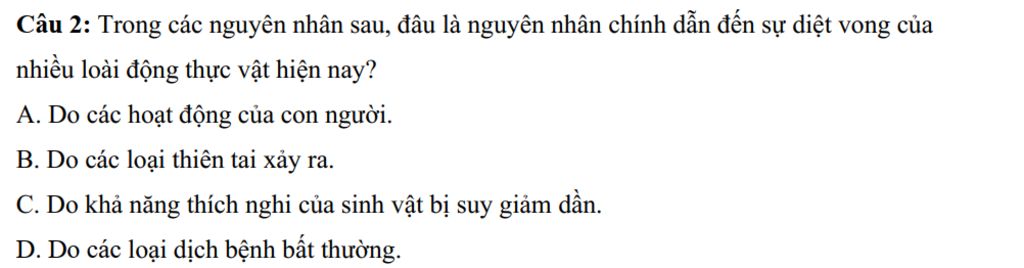 Câu `2:` Trong các nguyên nhân sau, đâu là nguyên nhân chính dẫn đến sự diệt vong của nhiều loài động thực vật hiện nay?