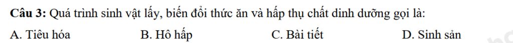 Quá trình sinh vật lấy, biến đổi thức ăn và hấp thụ chất dinh dưỡng gọi là tiêu hóa
