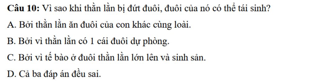 → Vì sao khi thằn lằn bị đứt đuôi, đuôi của nó có thể tái sinh? Bởi vì tế bào ở đuôi thằn lằn lớn lên và sinh sản.