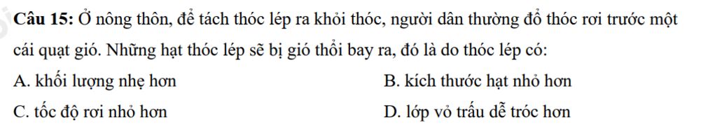 Câu 15: nông thôn, để tách thóc lép ra khỏi thóc, người dân thường đổ thóc rơi trước một cái quạt gió. Những hạt thóc lép sẽ bị gió thổi bay ra, đó là do thóc lép có: