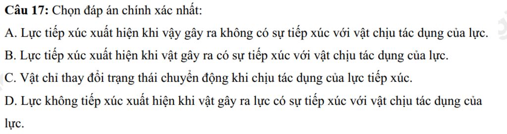 `=>``B.`Lực tiếp xúc xuất hiện khi vật gây ra có sự tiếp xúc với vật chịu tác dụng của lực.