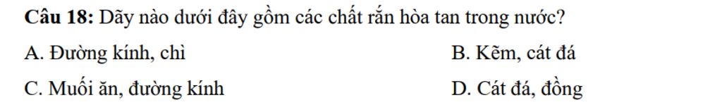 Câu `18:` Dãy nào dưới đây gồm các chất rắn hòa tan trong nước?