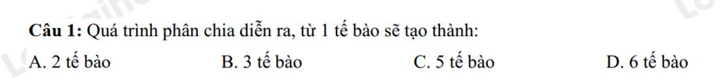 $⇒1$ tế bào phân chia $1$ lần tạo ra $1×2^1 =2$ tế bào con
