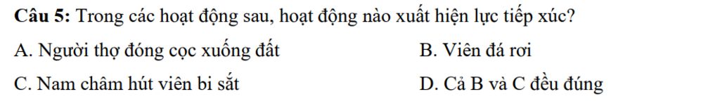 Câu 5: Trong các hoạt động sau, hoạt động nào xuất hiện lực tiếp xúc?