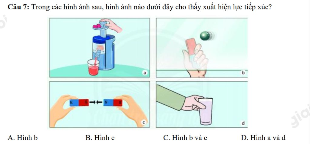 Trên hình, ta thấy hình a có lực tiếp xúc giữa tay và máy ép, hình b là lực hấp dẫn giữa nam châm và viên bi sắt, hình c là lực hấp dẫn giữa hai cực nam châm và hình d là lực tiếp xúc giữa tay và ly