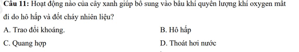 Hoạt động của cây xanh giúp bổ sung và bầu khí quyển lượng khí oxygen mất đi do hô hấp và đốt cháy nhiên liệu: