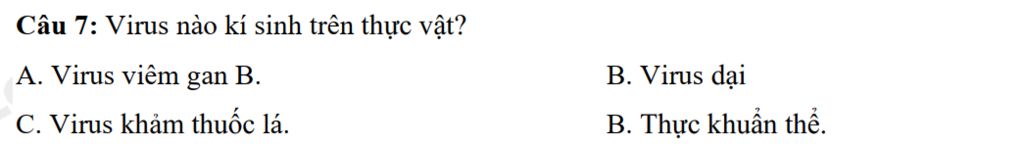 Câu `7` : Virus nào kí sinh trên thực vật?