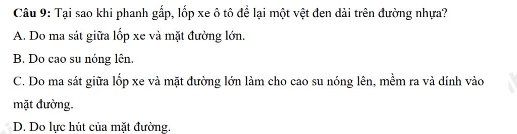 Khi phanh gấp, lốp xe ô tô để lại một vệt đen dài trên đường nhựa vì: Ma sát giữa lốp xe và mặt đường lớn làm cho cao su nóng lên, mềm ra và dính vào mặt đường.