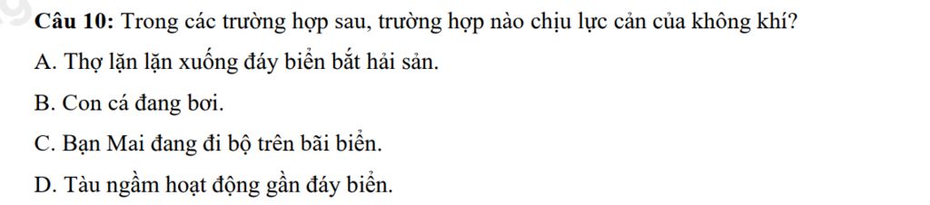 `D`. Tàu ngầm hoạt động gần đáy biển ( chịu lực cản của nước )