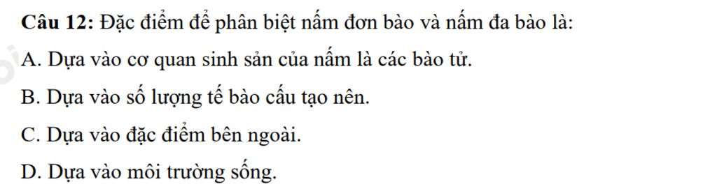 Câu 12: Đặc điểm để phân biệt nấm đơn bào và nấm đa bào là: