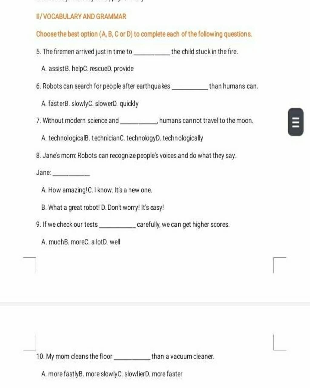 `->` Cụm từ 'more slowly' phù hợp với nghĩa và ngữ pháp của câu, vì nó chỉ ra rằng cách mẹ bạn lau nhà có tốc độ thấp hơn so với cách máy hút bụi lau nhà.