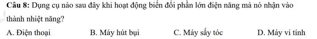 Trong các đáp án đã cho, dụng cụ khi hoạt động biến đổi phần lớn điện năng mà nó nhận vào thành nhiệt năng là máy sấy tóc